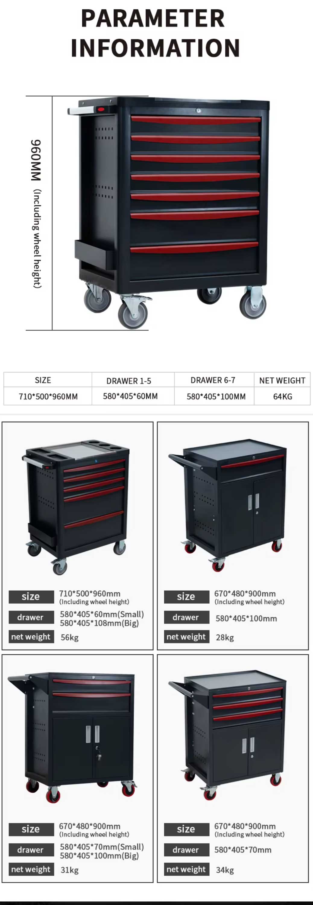 Tủ dụng cụ được làm bằng thép cường độ cao hoặc thép tấm cán nguội chất lượng cao làm vật liệu chính, được chế tạo thông qua quy trình xử lý bề mặt và gia công tinh xảo. Nó kết hợp các khái niệm thiết kế hiện đại và chức năng thực tế, cung cấp các giải pháp lưu trữ công cụ hiệu quả, ngăn nắp và an toàn cho các địa điểm sản xuất, văn phòng, trường học và các dịp khác. — Chất liệu thép cán nguội chất lượng, dễ lau chùi — Hoàn thiện sơn tĩnh điện thân thiện với môi trường, không mùi và không phai màu — Cấu trúc lắp ráp hoàn chỉnh, không cần lắp đặt — Hệ thống khóa trung tâm, tất cả các ngăn kéo đều có thể khóa được. — Sáu hoặc bảy ngăn kéo, đáp ứng các nhu cầu lưu trữ khác nhau — Bốn bánh xe ở phía dưới, dễ dàng di chuyển tủ đến bất cứ đâu — Có thể làm bất kỳ màu nào